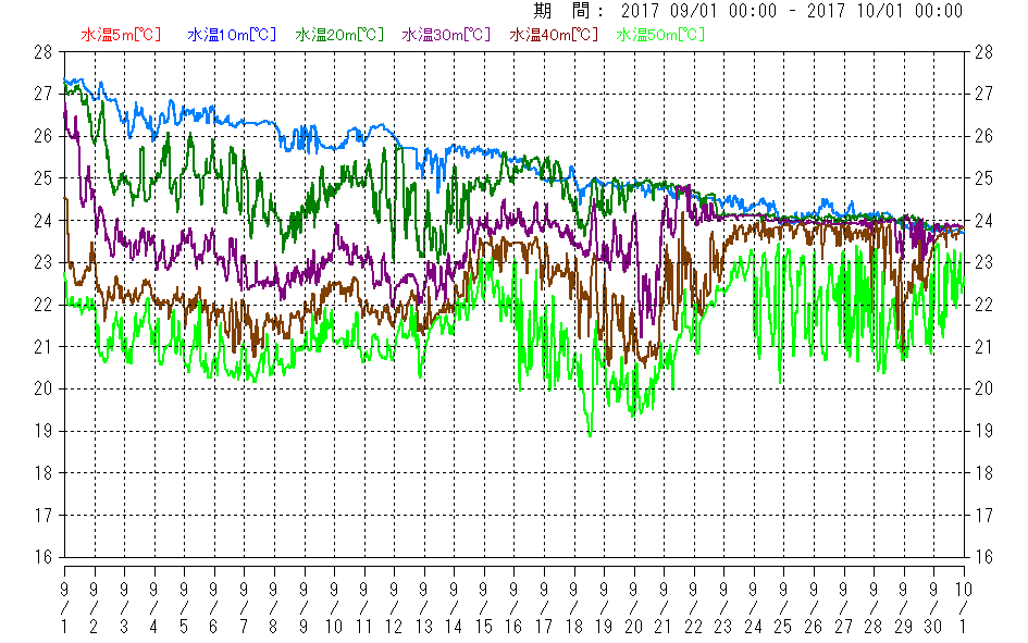 水温計は5月頃から10月頃まで、海面近くから海底まで5mまたは10mおきに設置しています。