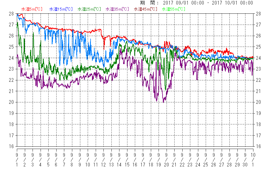 水温計は5月頃から10月頃まで、海面近くから海底まで5mまたは10mおきに設置しています。